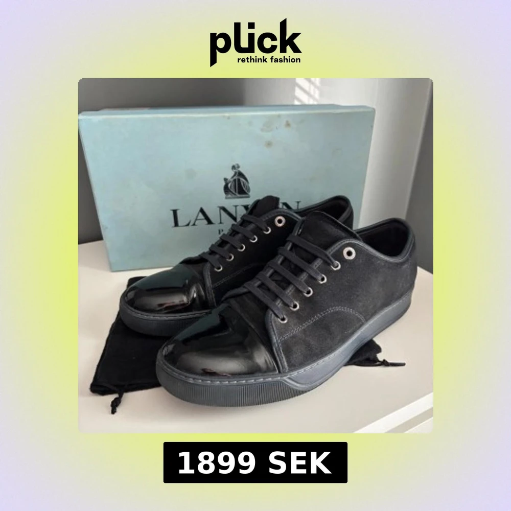 Snygga mörkablåa sneakers från Lanvin med en cool mix av mocka och lackad skinn på tån. Skorna har rund tå, platt sula och svarta snören med metallöglor. Insidan är fodrad med mjukt skinn för extra komfort. Perfekt för dig som gillar stilrena och lyxiga detaljer. Uk 10