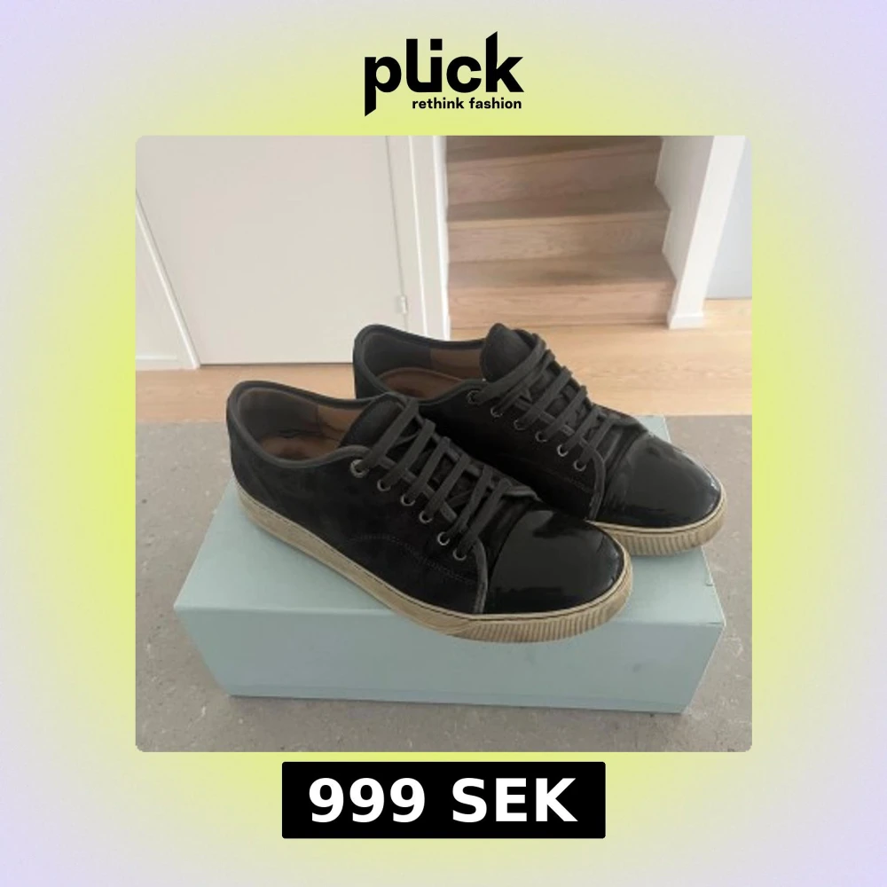 Säljer ett par svarta sneakers från Lanvin med snygg glansig tå. Skorna har snörning och en klassisk rund tå. Perfekta för dig som vill ha en stilren och exklusiv look. Dustbag och box ingår, finns även kvitto från care of carl