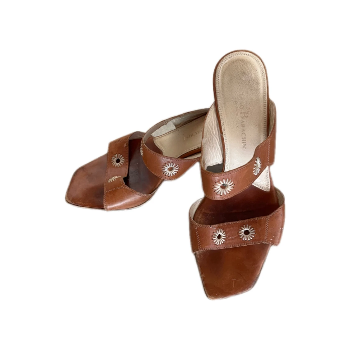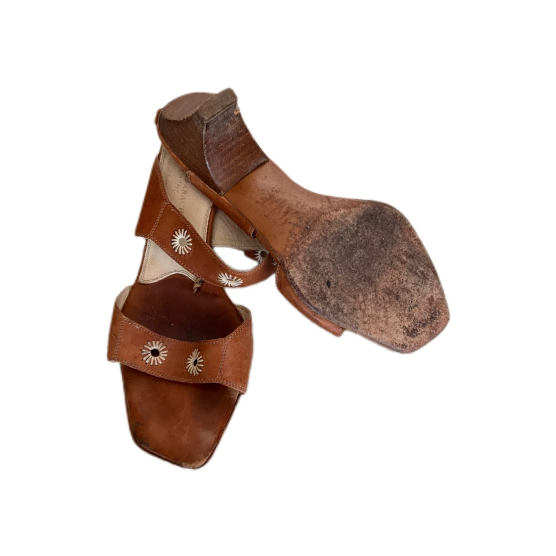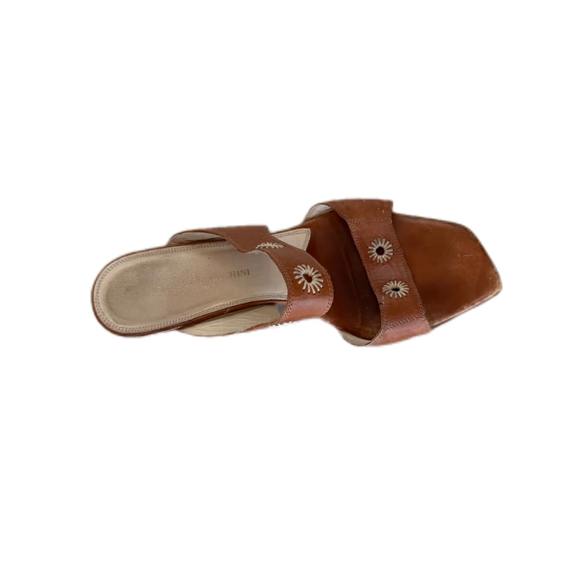 Snygga bruna sandaler i skinn med fyrkantig tå och låg klack. Två breda remmar över foten dekorerade med vita broderade blommor ger en cool vintagekänsla. Perfekta för sommarens alla outfits och lätta att matcha med jeans eller klänning.