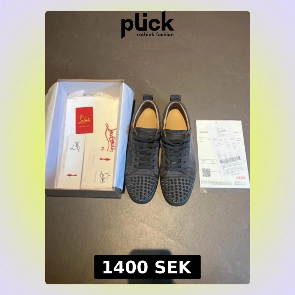 Säljer ett par svarta sneakers från Christian Louboutin i mocka med nitar på tån. Skorna har snörning och klassisk rund tå. Kommer med originalkartong, dustbag och äkthetskort. Perfekta för dig som vill sticka ut med exklusiv streetstyle.