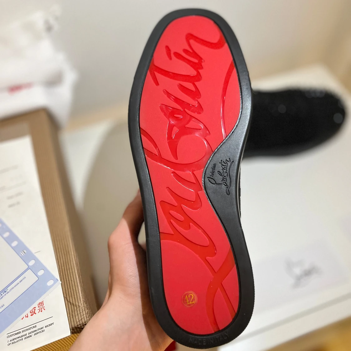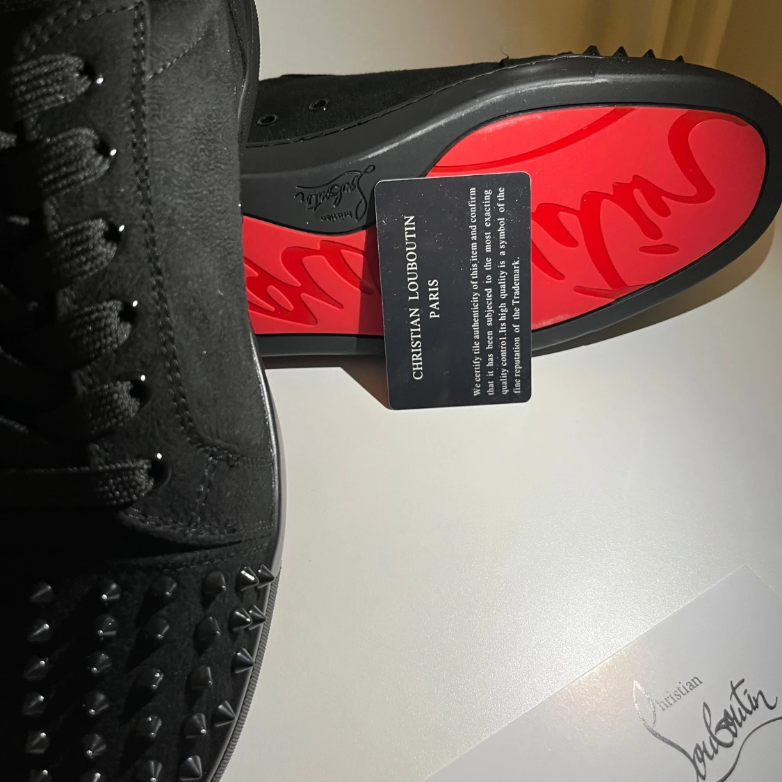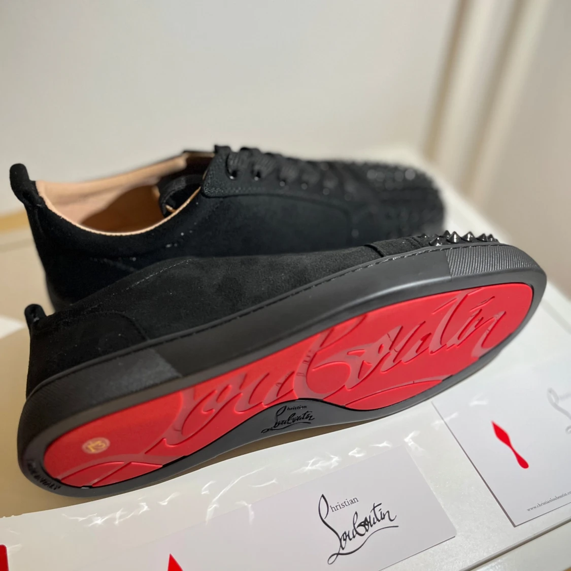 ⬛ Färg: Svart med nitar 👞 Modell: Christian Louboutin med signaturspikes 📏 Storlek: EU 42 🔍 Använda sparsamt och i mycket fint skick — inga större märken eller slitage. ♻️ Mycket väl omhändertagna, förvarade i dustbag. Ikoniska röda sulan i gott skick. 💼 Material: Premium mocka med nitar och klassisk röd sula 🧾 KÖP NU FINNS 🧾 Tack!