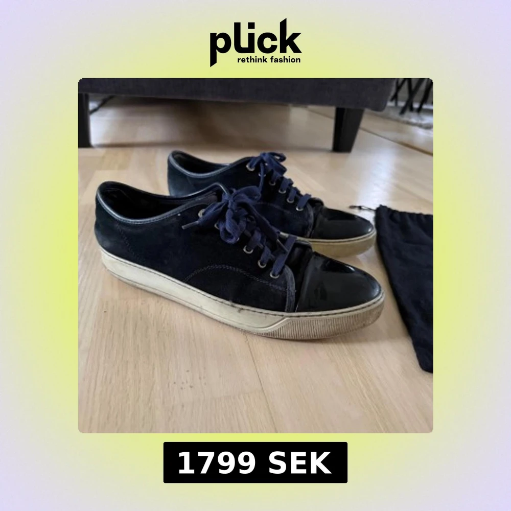 UK 10, passar 45. Jättebra skick utom ena hälen på insidan. Inget som syns när dom är på och inget som stör en. Snygga svarta sneakers från Lanvin med ovandel i mocka och tåparti i blankt skinn. Skorna har mörkblå snörning, vit platt sula och rund tå. Perfekt för dig som gillar stilrena och exklusiva sneakers med en unik touch.