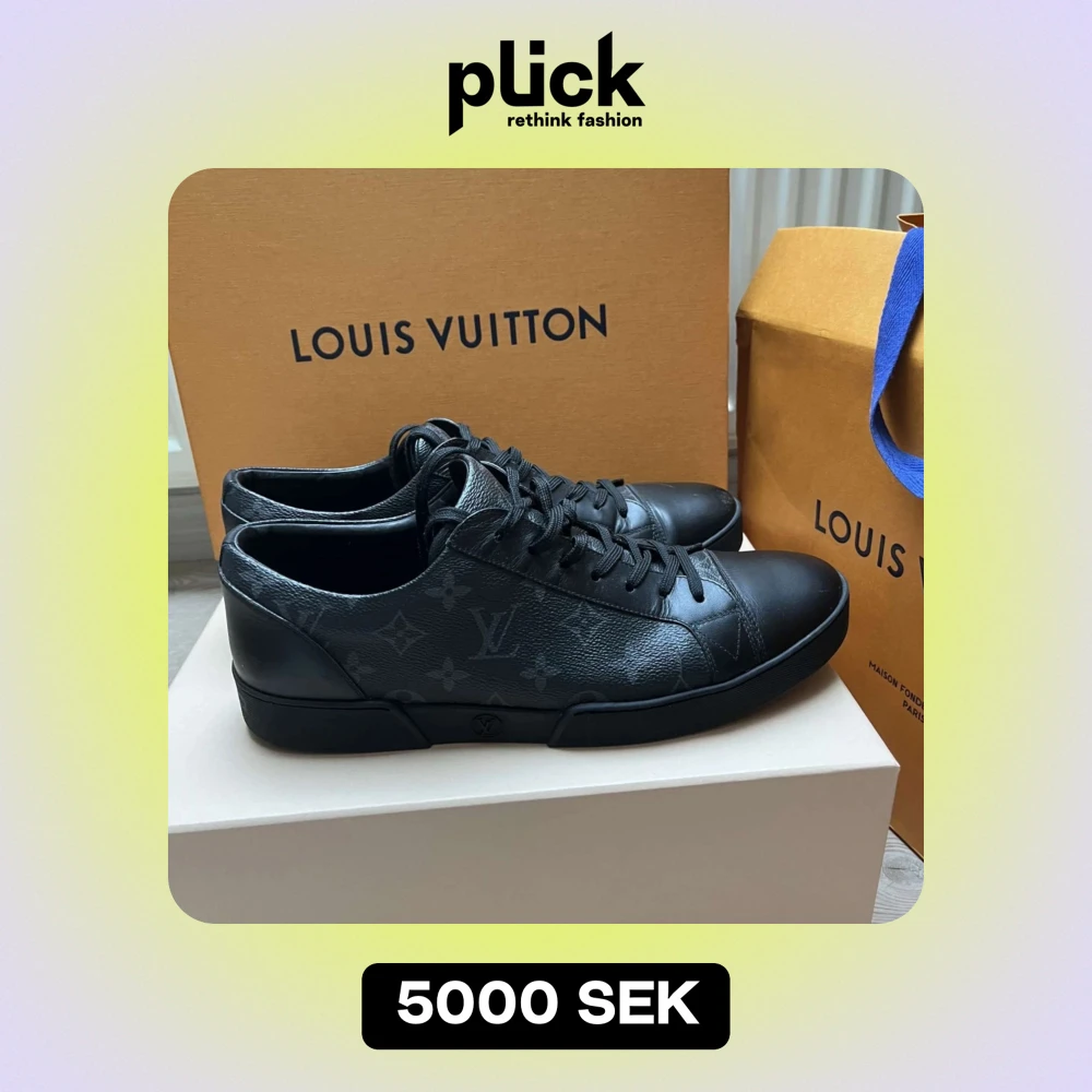 Snygga svarta sneakers från Louis Vuitton med monogrammönster. Skorna har en elegant design med snörning och är tillverkade i skinn. Perfekta för en stilren look. Kvitto bags box allt följer med