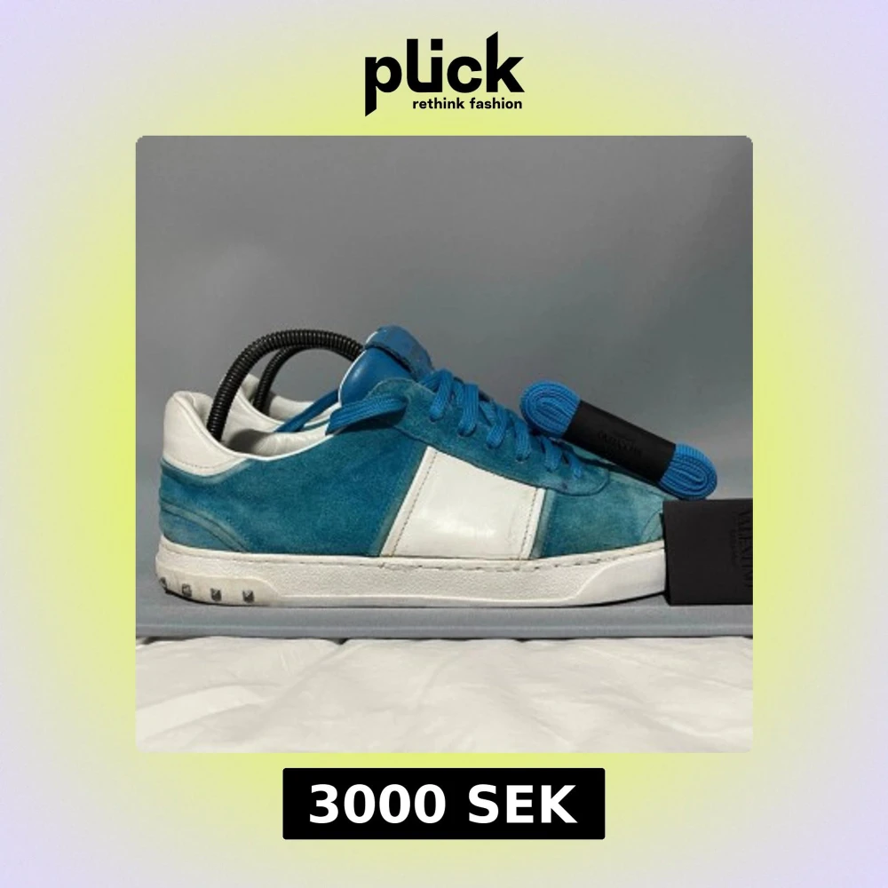 Säljer ett par Valentino flycrew sneakers i blå mocka och vitt skinn. Skorna har blå snörning, vita detaljer på sidan och coola nitar på hälen. Klassisk rund tå och platt sula. Extra blå skosnören medföljer. Perfekta för dig som vill sticka ut med stil.