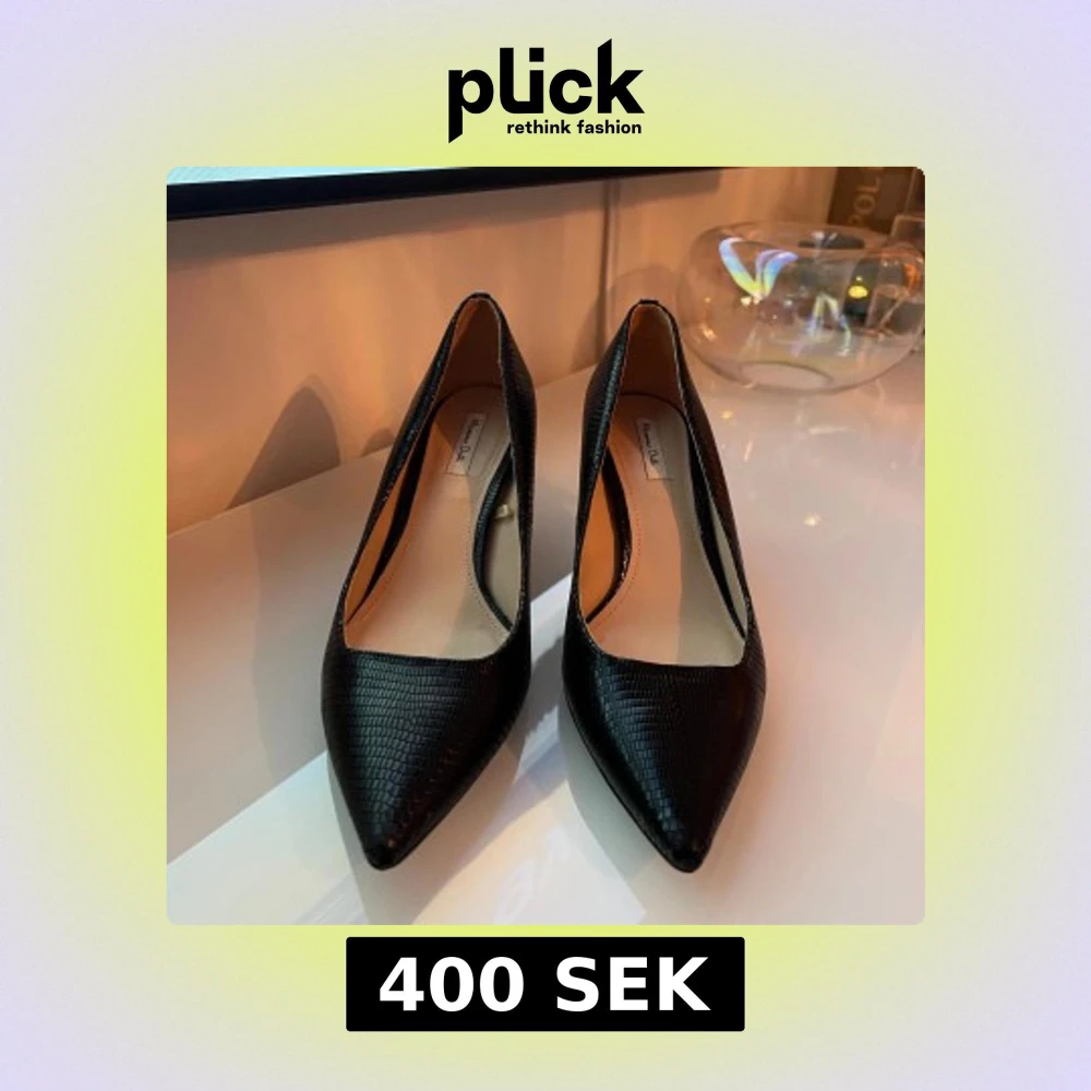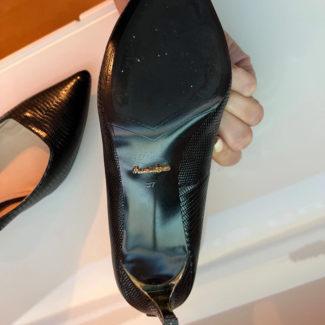 Eleganta svarta pumps från Massimo Dutti med en spetsig tå och klack använda en gång. Skorna har en texturerad yta som ger en lyxig känsla. Perfekta för en stilren look. Supersnygga men köpte fel storlek.