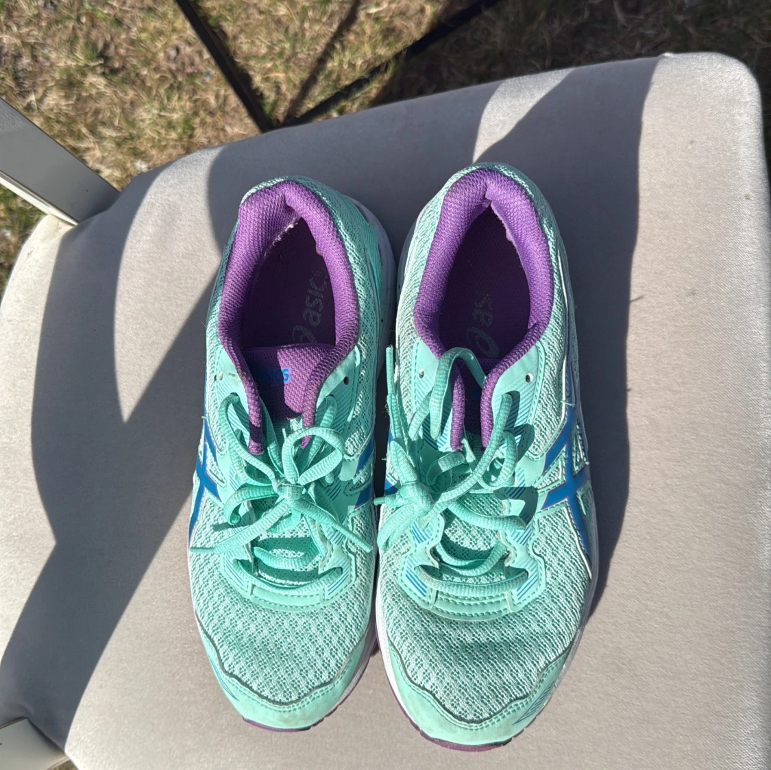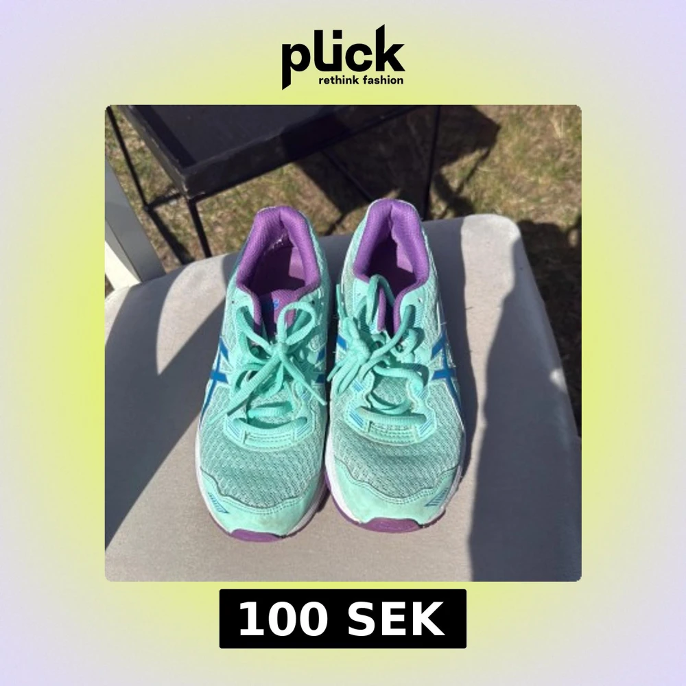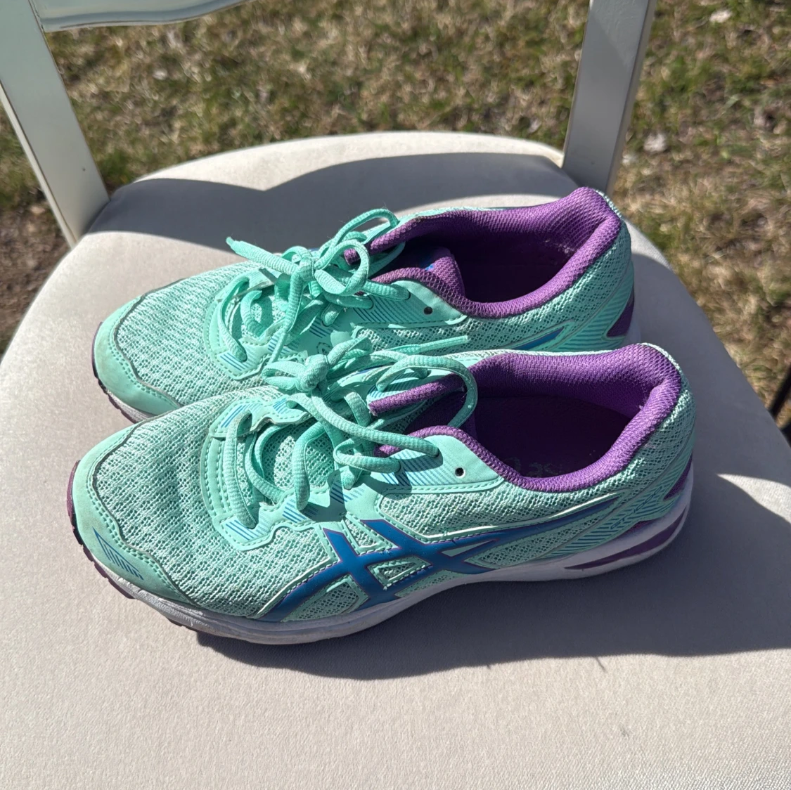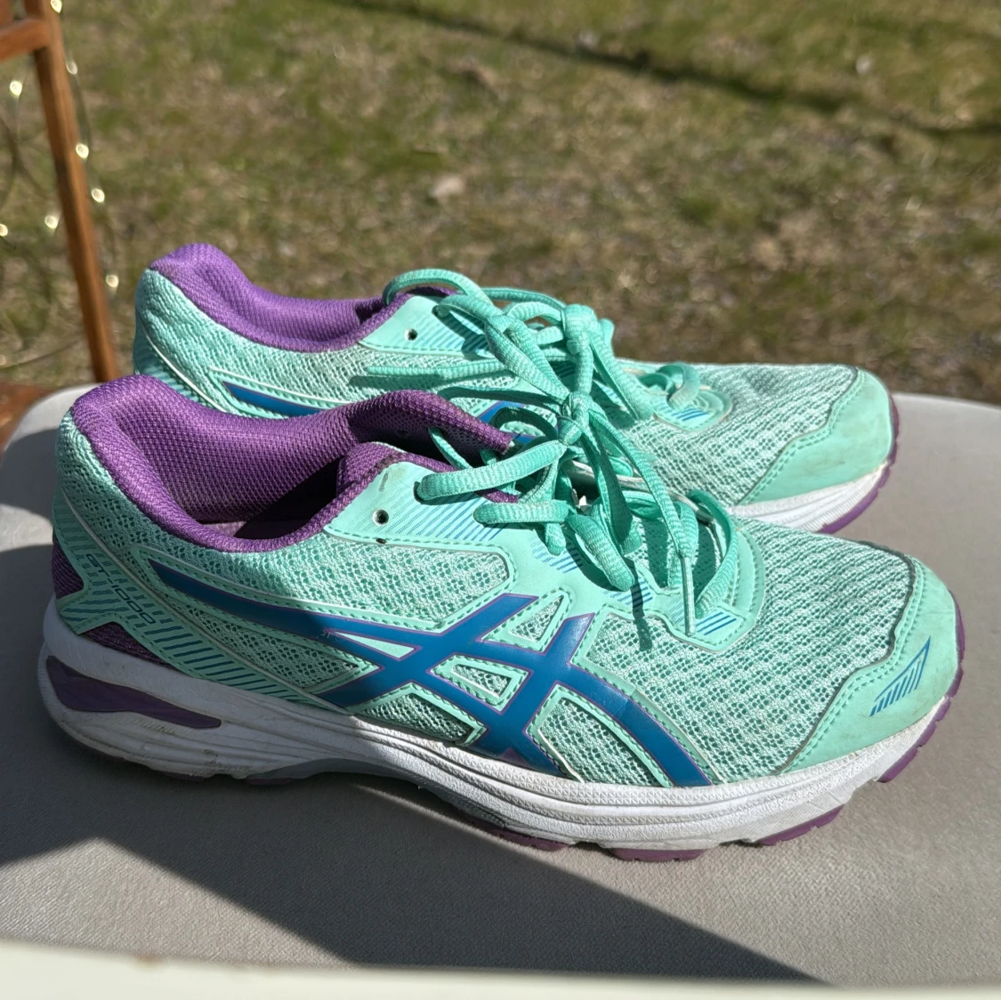 Säljer ett par fräscha mintgröna träningsskor från Asics med lila detaljer. Skorna har snörning och en bekväm passform, perfekt för löpning eller gymmet. De har en rund tå och en stabil sula för bra grepp.
