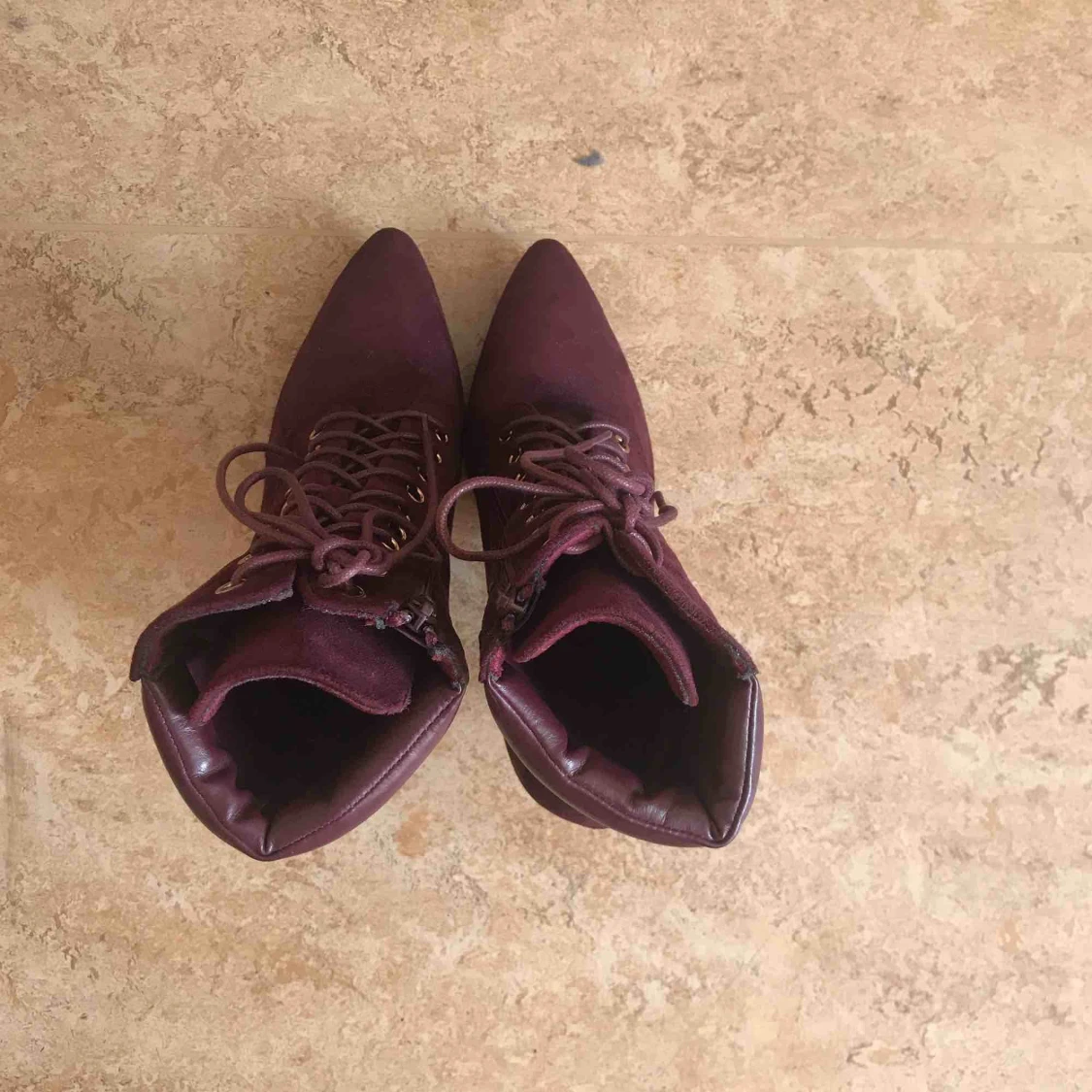 Klackskor i burgundy. Cirka 7-10 cm höga. Har aldrig använt de. Pris kan förhandlas.
