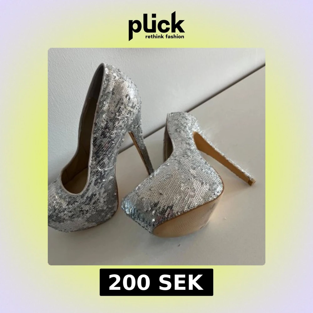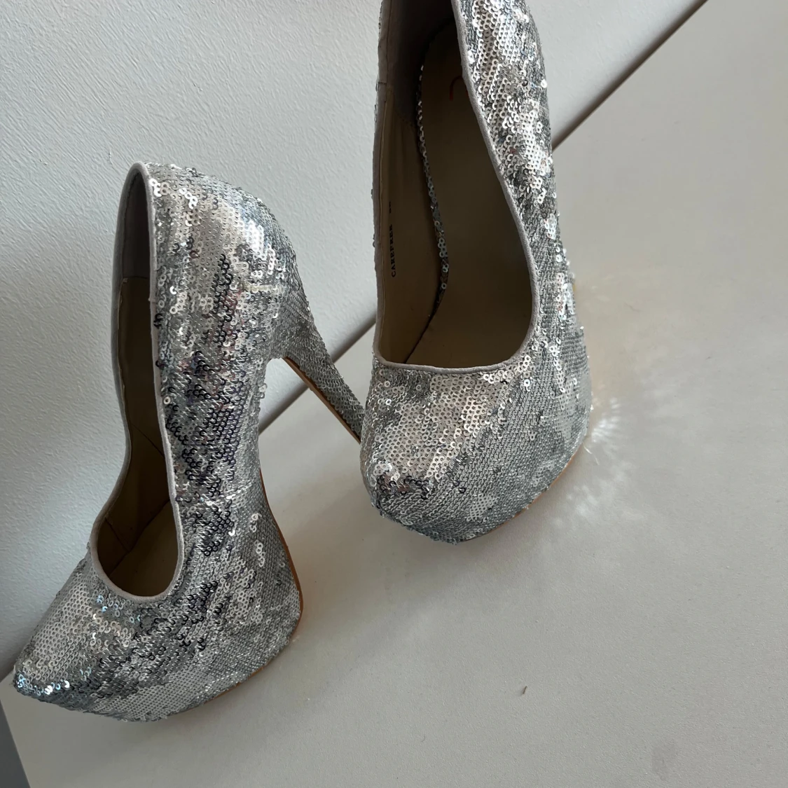 Säljer ett par höga pumps i silver med glittriga paljetter över hela skon. Skorna har en rejäl klack och plattform framtill, samt rund tå. Perfekta för att sticka ut på festen!