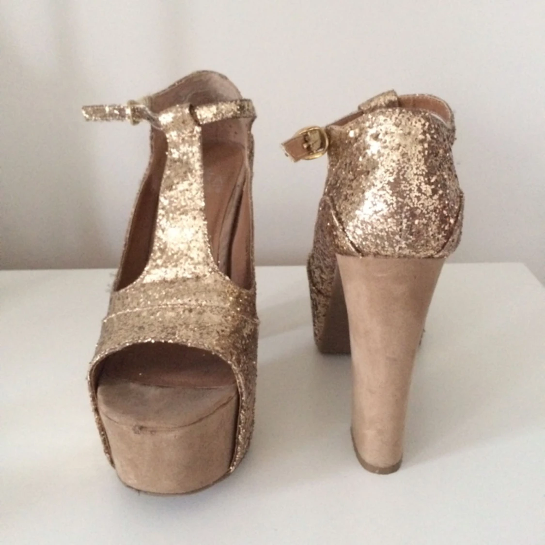 Slitna men charmiga klackskor med guld som skimrar, flitigt använda under en period för några år sen.. 13cm klackar, storlek 40 men passar även en 39a, vilket är ännu charmigare med dom. Köpare står för frakt