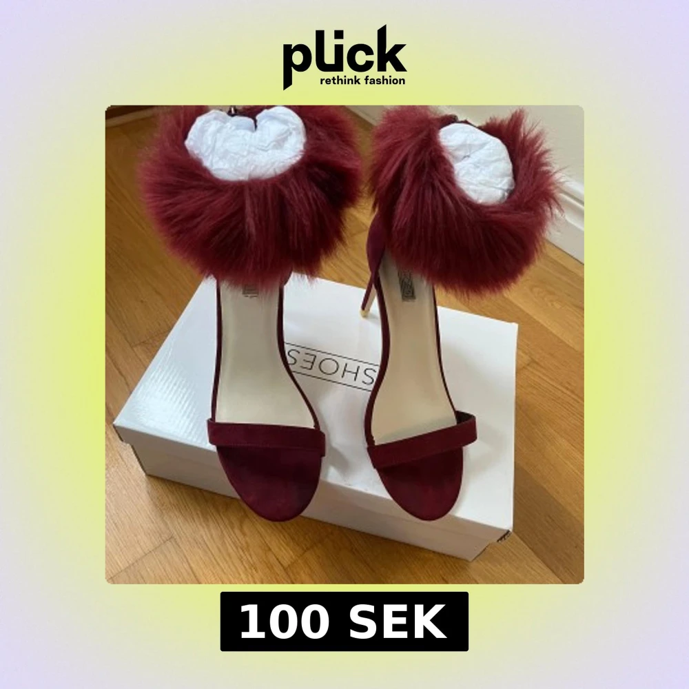 Snygga vinröda klackskor med pälsdetalj runt ankeln. Skorna har en öppen tå och en elegant klack, perfekt för att sticka ut på festen. Använda en gång. Fortfarande i original pack