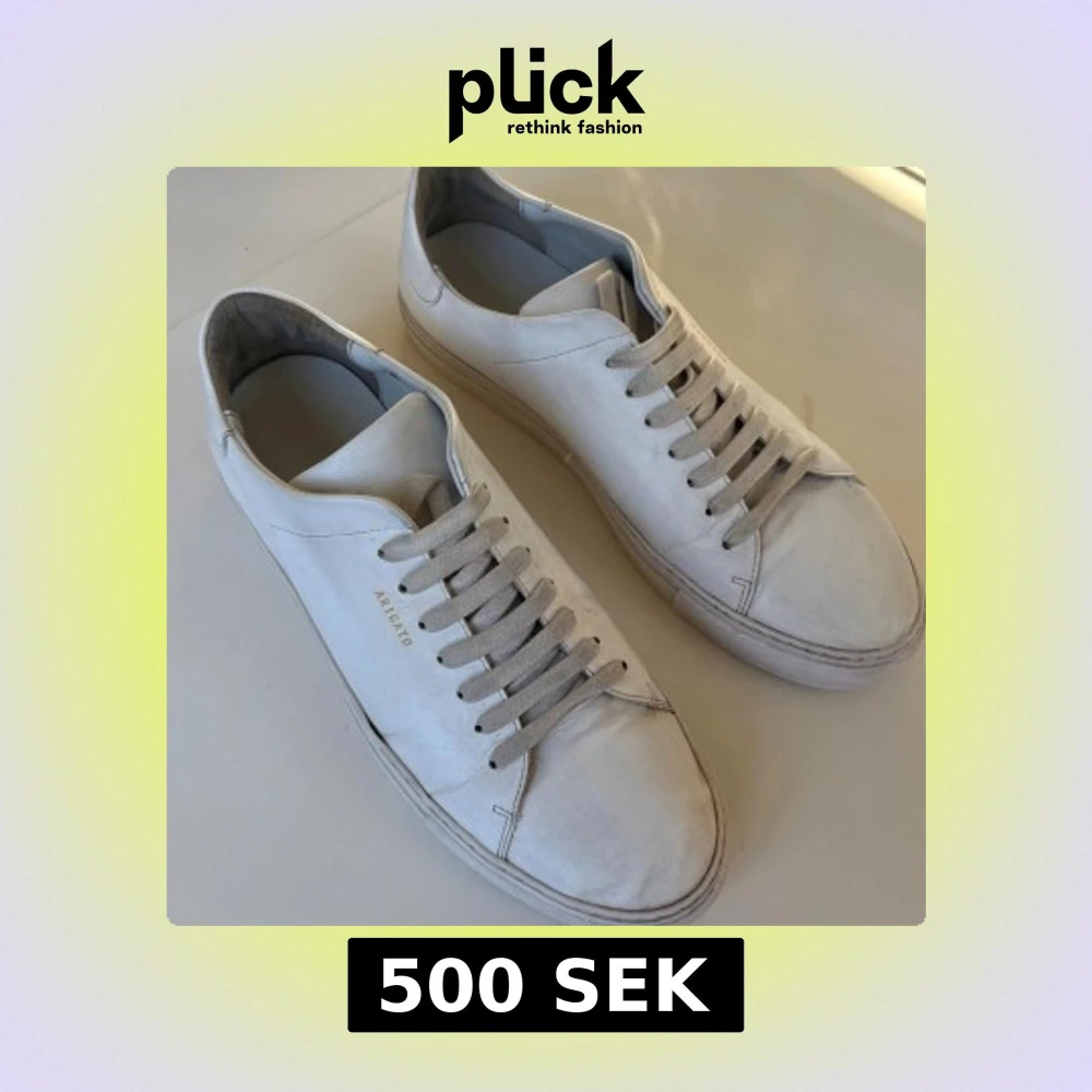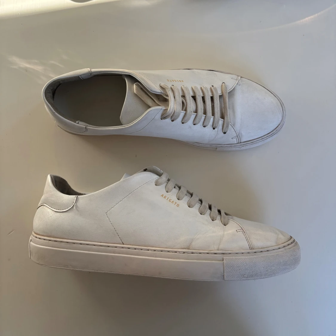 Snygga vita sneakers från Axel Arigato med minimalistisk design och guldfärgad logga på sidan. Skorna har rund tå, platt sula och klassisk snörning. Storlek 44
