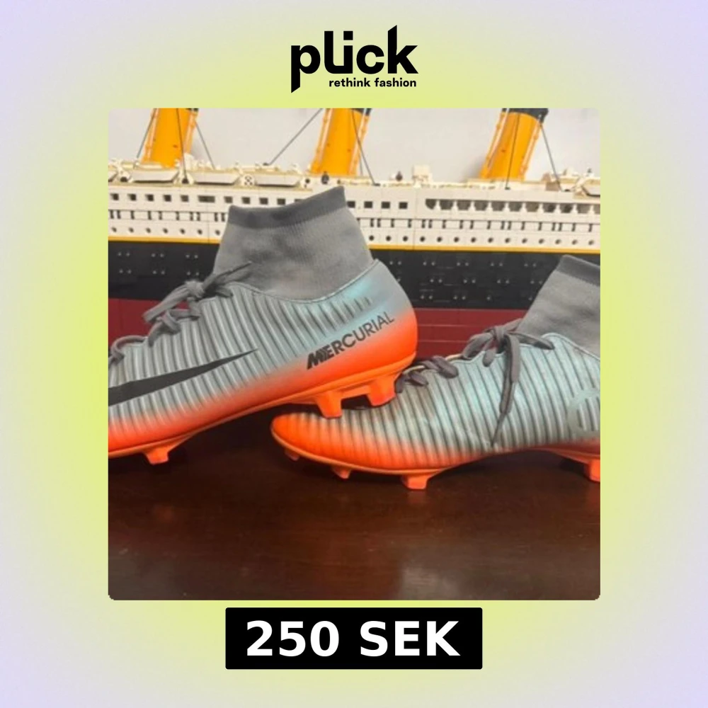 Säljer ett par Nike Mercurial fotbollsskor med grå ovandel och orange sula. , högt skaft i stretchigt material och stora svarta Nike-loggor på sidorna. Perfekta för dig som vill ha stilrena och snabba skor på planen. Har tagit bort snörerna men kan skicka med dom.