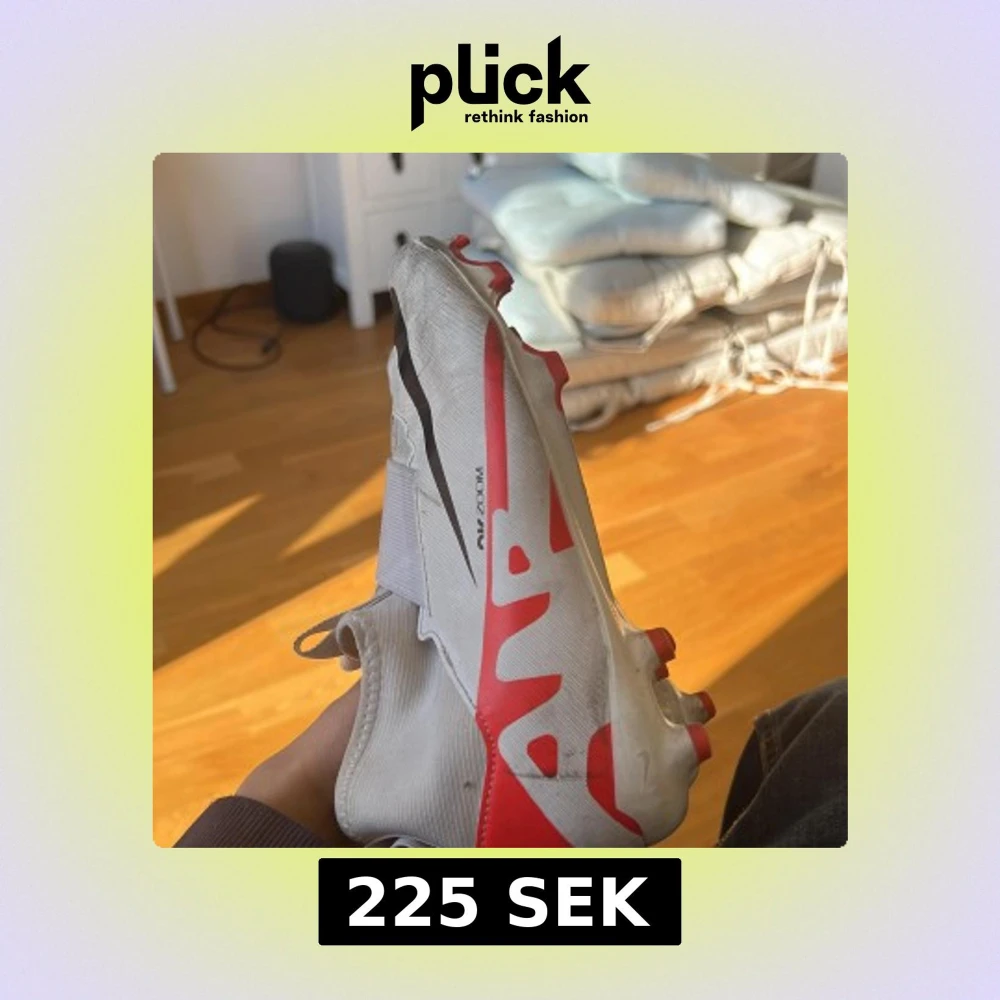 Snygga fotbollsskor från Nike i vitt med röda och svarta detaljer. Skorna har en strömlinjeformad design med dobbar för optimalt grepp på planen. Perfekta för fotbollsspelare som vill ha stil och funktionalitet.