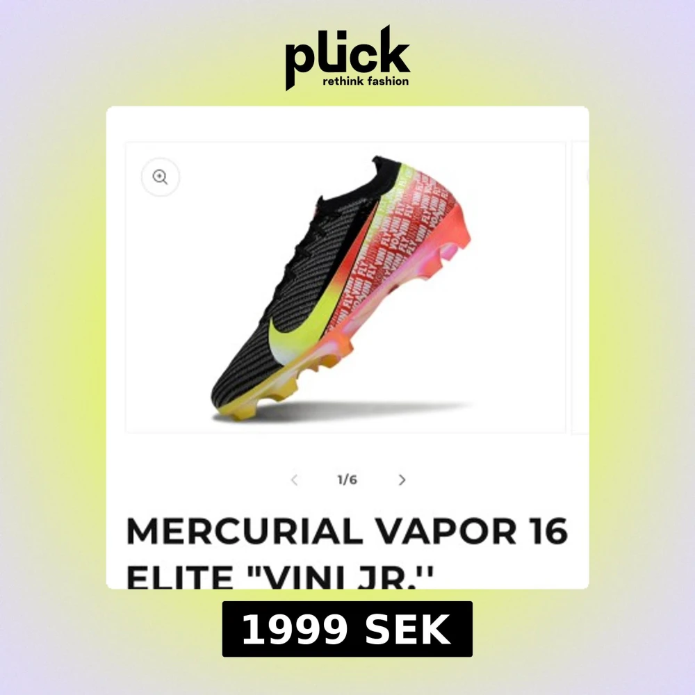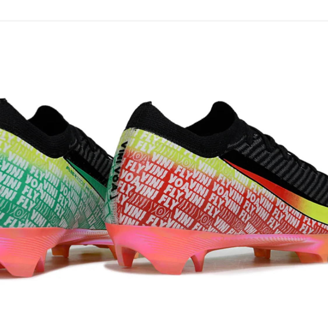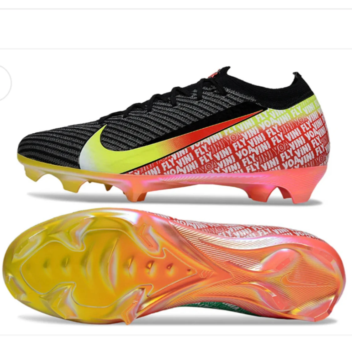 Säljer ett par Nike Mercurial Vapor 16 Elite Vini Jr. fotbollsskor med svart ovandel, färgskiftande sula i gult, orange och rosa samt textmönster i grönt, rött och vitt. Skorna har snörning, låg profil och är tillverkade i syntetmaterial för maxad känsla på planen.den börjar från storlek 36
