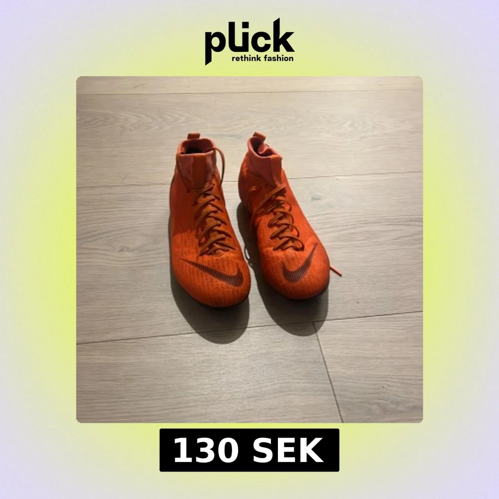 Säljer ett par Nike Mercurial fotbollsskor i en riktigt snygg orange färg med svarta detaljer och logga. Skorna har snörning, högre skaft och platt sula med dobbar för gräsplan. Tillverkade i syntetmaterial för lätt känsla och bra grepp på planen.