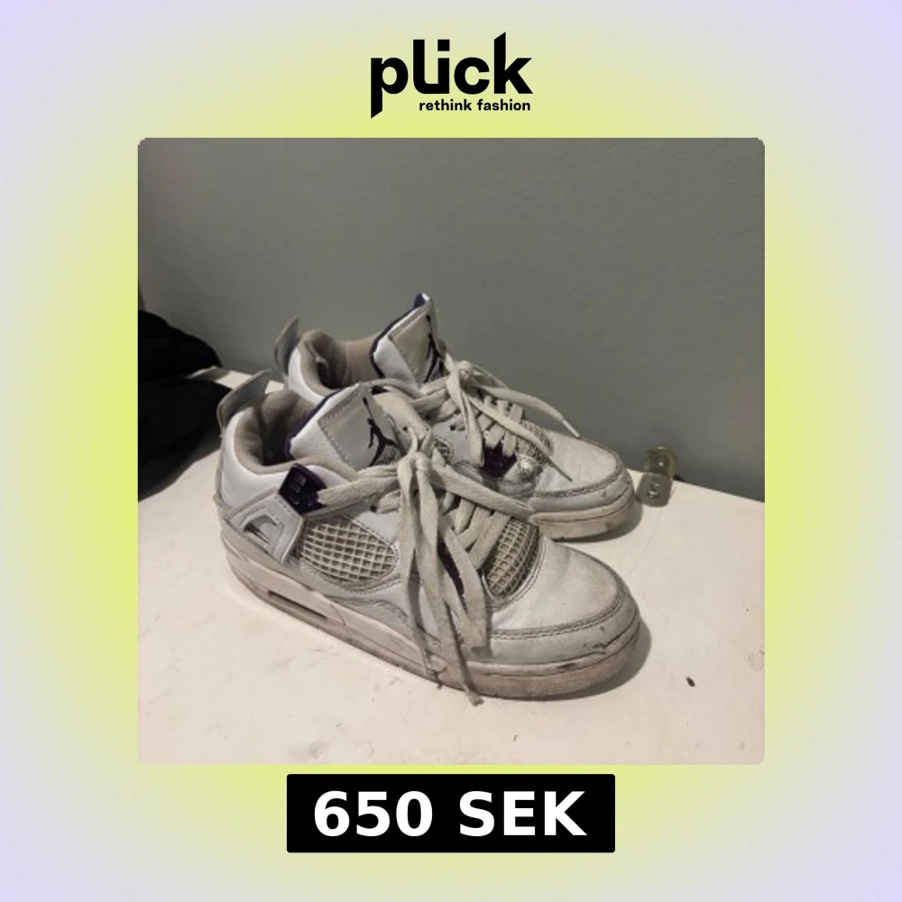 Säljer ett par vita Nike Air Jordans med lila detaljer. Skorna har snörning och en klassisk design med synlig luftdämpning i sulan. Perfekta för dig som älskar en sportig stil med en touch av färg.