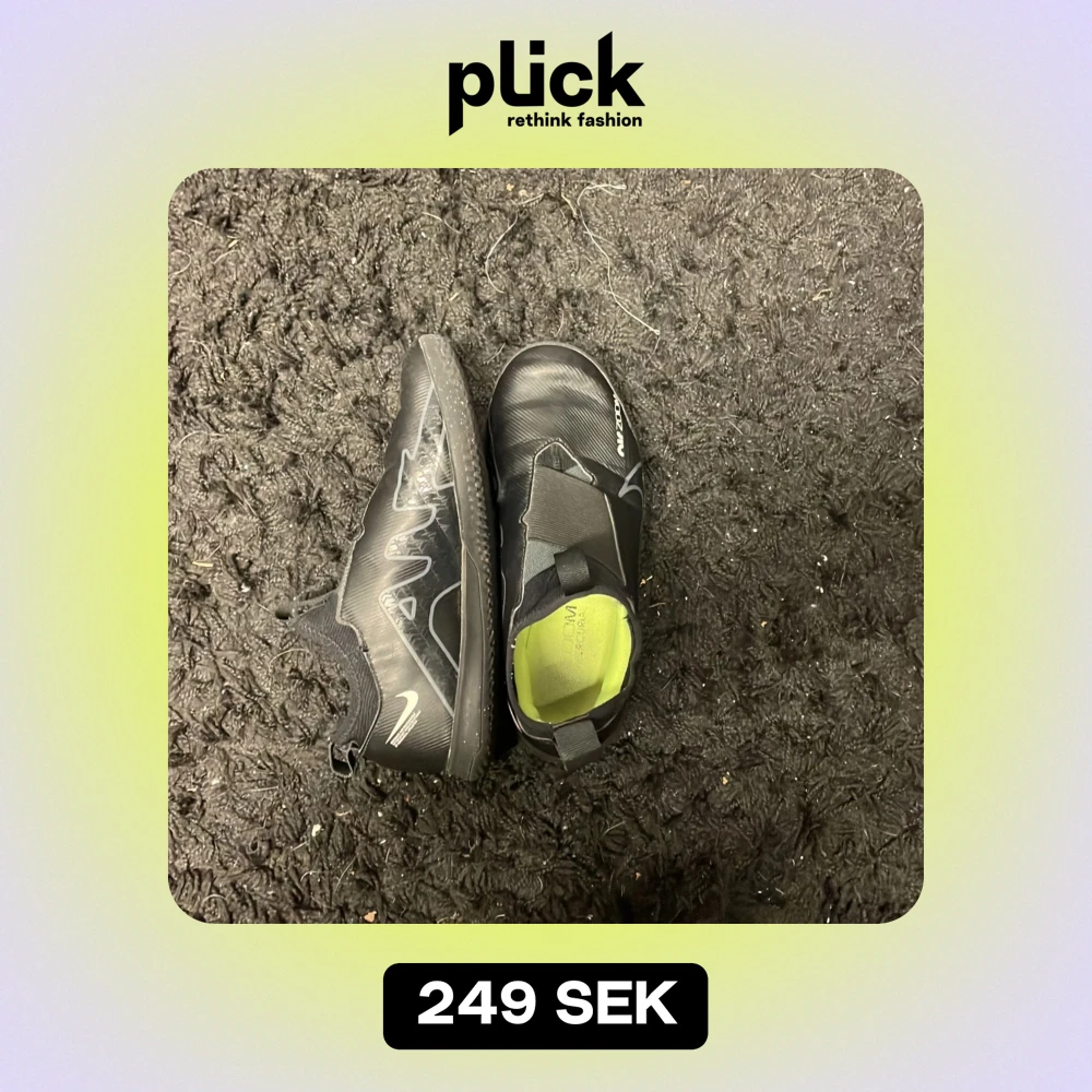 Säljer ett par svarta Nike fotbollsskor i bra skick. De har en cool design med vita detaljer och en slitstark sula. Perfekta för både träning och match! Skorna har en elastisk passform utan snörning, vilket gör dem lätta att ta på och av. Innersulan är grön och ger bra komfort. Skorna är perfelta nu inför vintern och futsal säsongen. Skorna kostar nypris 649kr.