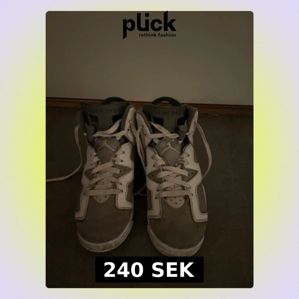 Säljer ett par Nike Air Jordan 6 Retro i grått och vitt. Skorna har högt skaft, snörning och coola detaljer på sidorna. Ovandelen är i skinn och mocka, med klassisk Jordan-logga på plösen. Perfekta för dig som gillar streetstyle och sneakers med attityd.