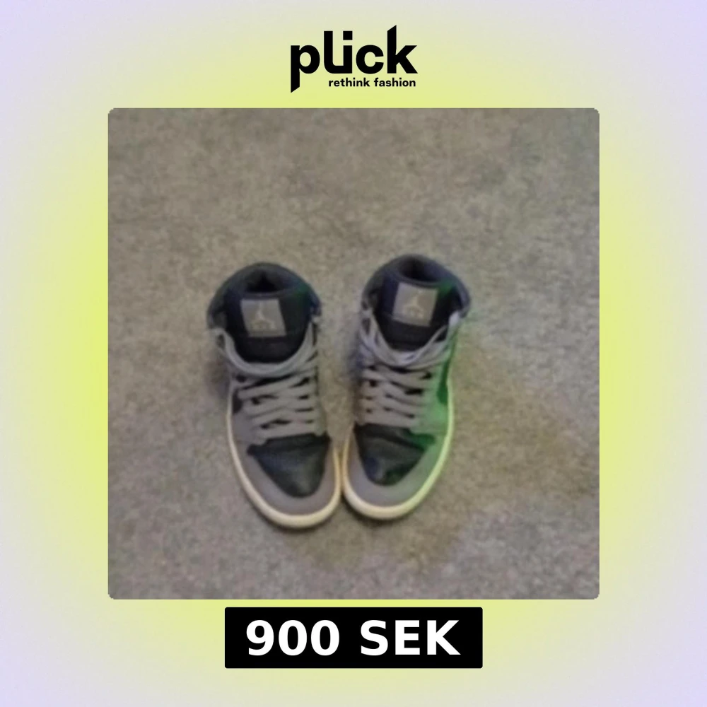 Säljer ett par grå Nike Air Jordans med snörning och klassisk design. Skorna har en vit sula och en svart swoosh på sidan. Perfekta för dig som älskar sneakers med stil.