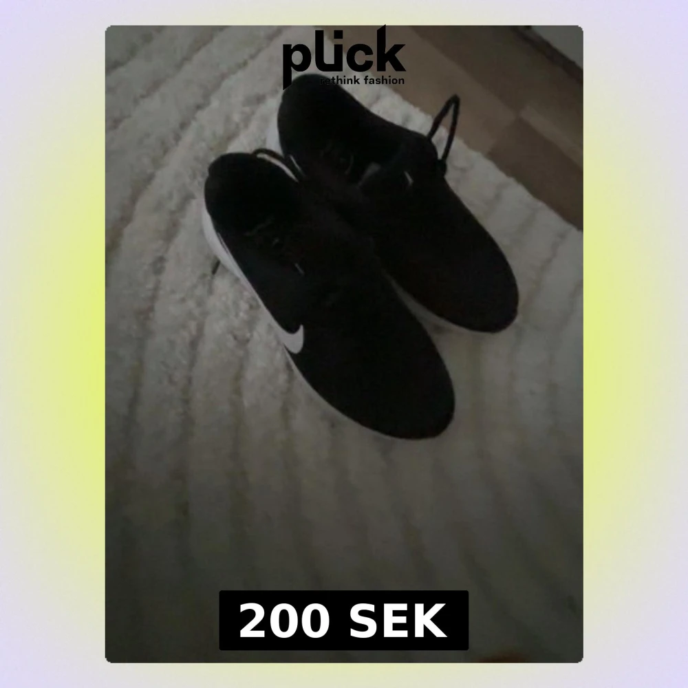 Säljer ett par svarta Nike sneakers med vit sula och klassisk vit swoosh på sidan. Skorna har snörning och är tillverkade i syntetmaterial, perfekta för träning eller chill vardagsstil. Lätta och bekväma med sportig vibe.