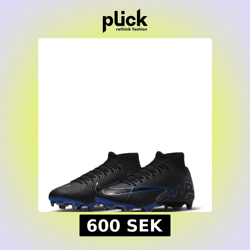 Säljer ett par Nike Mercurial Zoom fotbollsskor i svart med blå detaljer och silvriga nike loggor. Skorna har snörning, platt sula med dobbar och en strumpliknande passform runt ankeln. Tillverkade i syntetmaterial för bästa grepp och känsla på planen. Säljs för jag inte använder de mer. Skriv för bilder på dem!😊