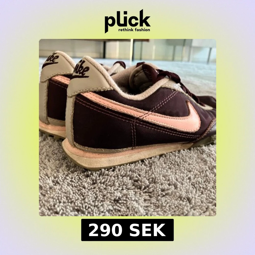 Säljer ett par retroinspirerade Nike sneakers i mörklila med ljusrosa swoosh och detaljer. Skorna har snörning, platt sula med mönster undertill och rund tå. Perfekta för dig som gillar en sportig och vintage look. Jättebra skick, knappt använda!