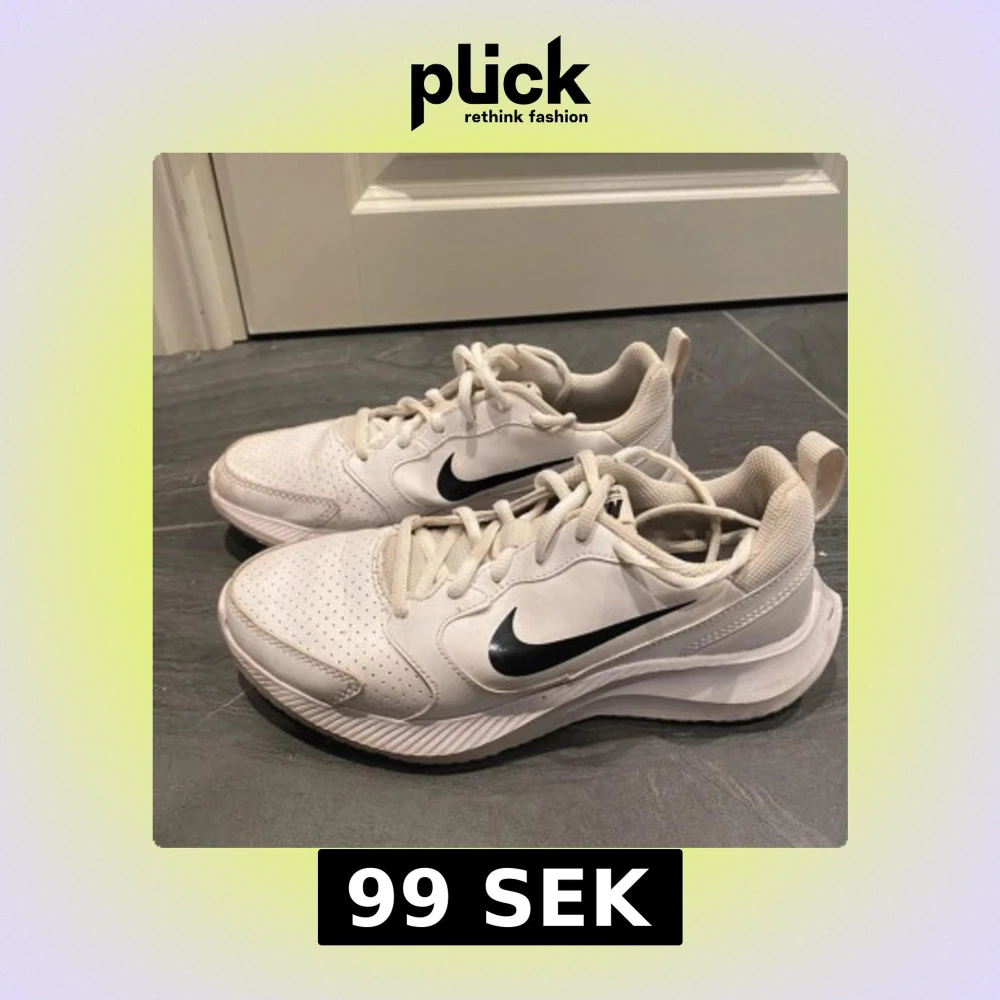 Säljer ett par vita Nike sneakers med svart swoosh på sidorna. Skorna har snörning, perforerad tå och en chunky sula. Ovandelen är i syntet och mesh för bra andningsförmåga. Perfekta för dig som gillar sportig och clean stil.