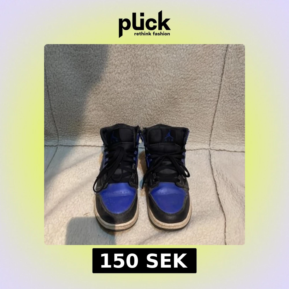 Säljer ett par klassiska Nike Air Jordans i svart och blått. Skorna har en hög modell med snörning och en ikonisk design. Pris kan diskuteras.