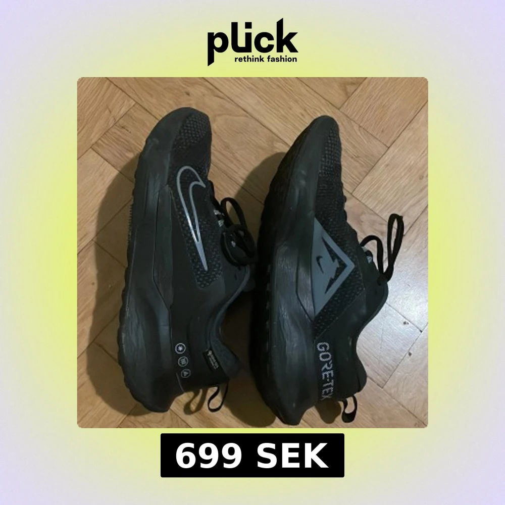 Svarta Nike Trail sneakers med Gore-Tex för vattentäthet. Snygg design med reflekterande detaljer och stora Nike-loggor i silver. Grov sula för extra grepp, snörning och meshpaneler för andningsförmåga. Perfekta för utomhusaktiviteter och tuffare väder.