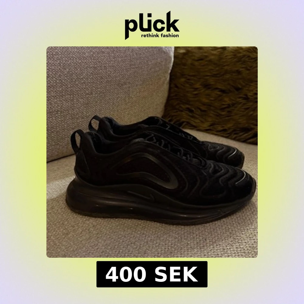 Säljer ett par svarta Nike Air Max 720 sneakers med vågigt mönster och chunky plattformssula. Skorna har snörning och en rund tå, tillverkade i syntetmaterial med meshdetaljer för extra ventilation. Perfekt för dig som gillar sportig och modern stil.