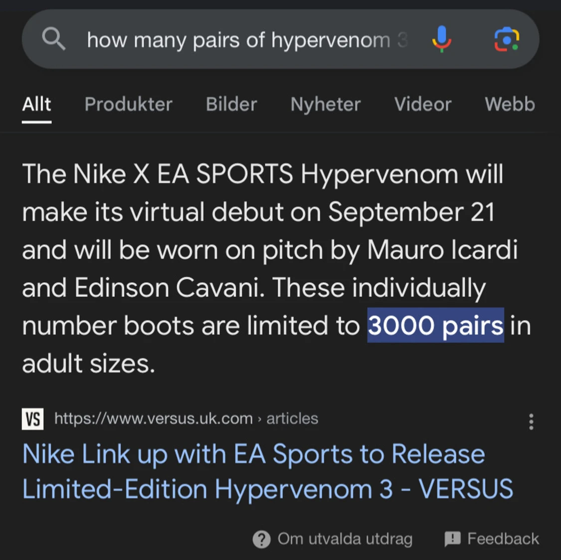 Säljer ett par Hypervenom 3 EA SPORTS edition fotbollskor dom är från 2018 och är limited edition det var en kollaburiation med Nike och rå sports dom tillverkades bara 3000 i världen, storlek 38,5 och priset kan diskuteras vid snabb affär