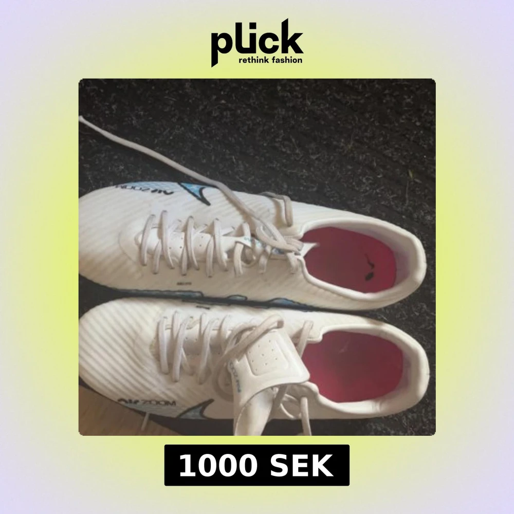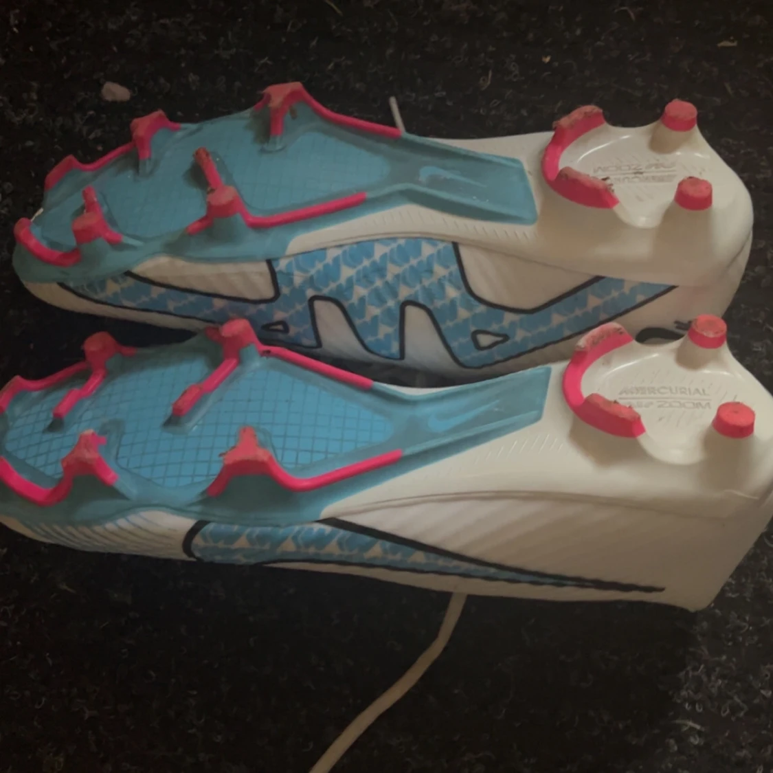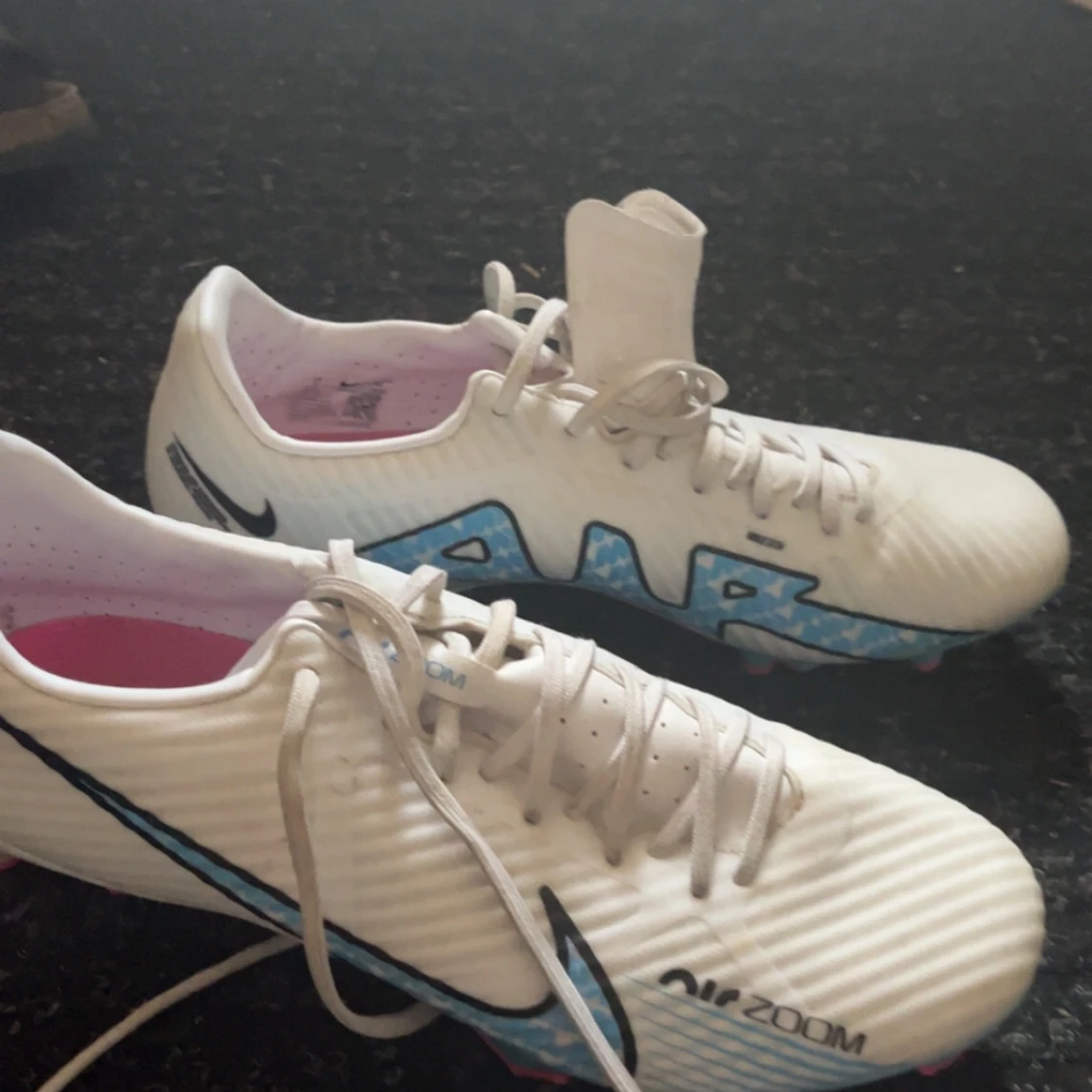 Säljer ett par Nike Mercurial Air Zoom fotbollsskor i vitt med blå och svarta detaljer samt rosa insida. Skorna har snörning och en platt sula med blå och rosa dobbar för gräsplan. Materialet är syntet och designen är sportig med AIR-tryck på sidan.