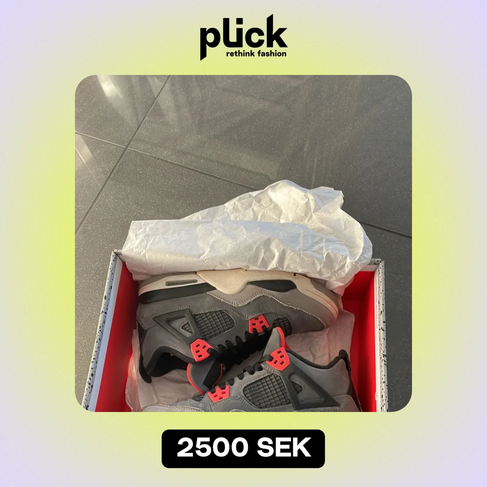 Nike Air Jordans 4 Infrared. Grått och svart med röda detaljer. Skorna är i mycket bra skick och har en snygg design med snörning och en bekväm passform. Perfekta för både vardag och fest! Köptes för ungefär 3200kr. Priset kan diskuteras!!!! Kommer i samma låda som den köptes i. Kan visa verifierad autenticitet!