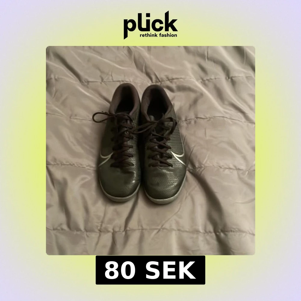 Säljer ett par svarta Nike fotbollsskor med silverdetaljer och snörning. Skorna har en låg profil och är tillverkade i syntetmaterial med mönstrad sula för bra grepp på planen. Perfekta för dig som vill ha stilrena och funktionella skor till inomhusfotboll.