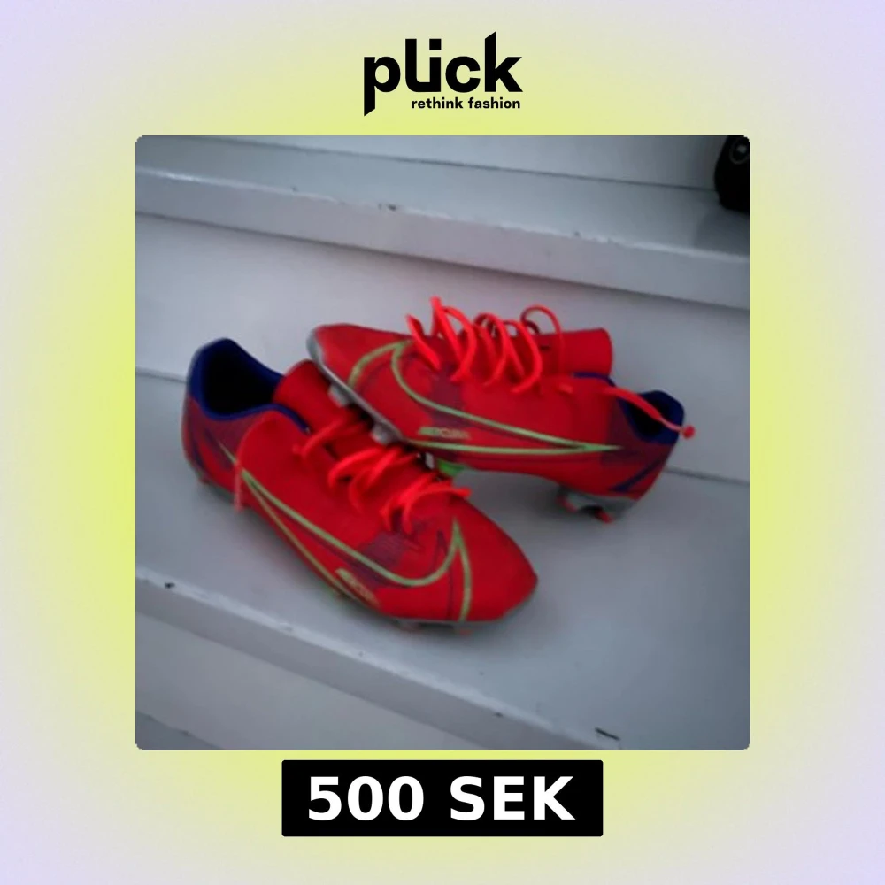 Säljer ett par Nike Mercurial fotbollsskor i rött med neongröna detaljer och blå insida. Skorna har snörning och är designade för gräsplan, med låg profil och platt sula. Perfekta för dig som vill sticka ut på planen med stil.