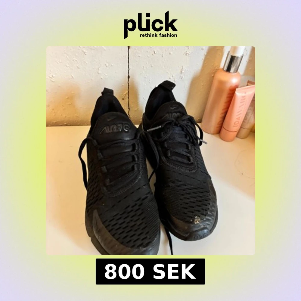 Säljer ett par helsvarta Nike Air Max 270 sneakers med mesh-överdel och synlig Air-enhet i hälen. Skorna har snörning och en sportig vibe, perfekt för dig som gillar streetstyle. Snygg och clean design med diskreta Nike-loggor på tungan och sidan.
