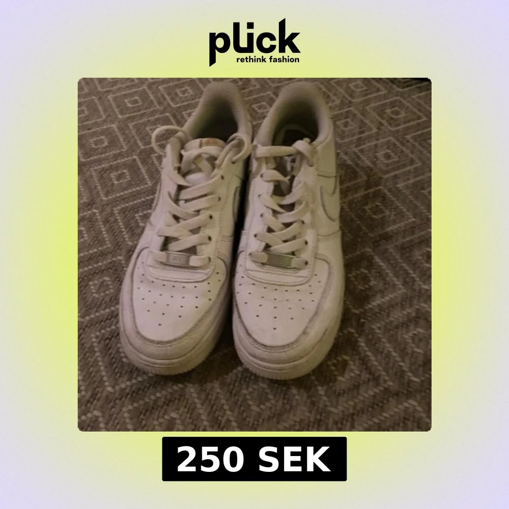 Säljer ett par klassiska vita Nike Air Force sneakers. De har en stilren design med snörning och perforerade detaljer på ovansidan för bättre ventilation. Perfekta för en avslappnad och sportig look.