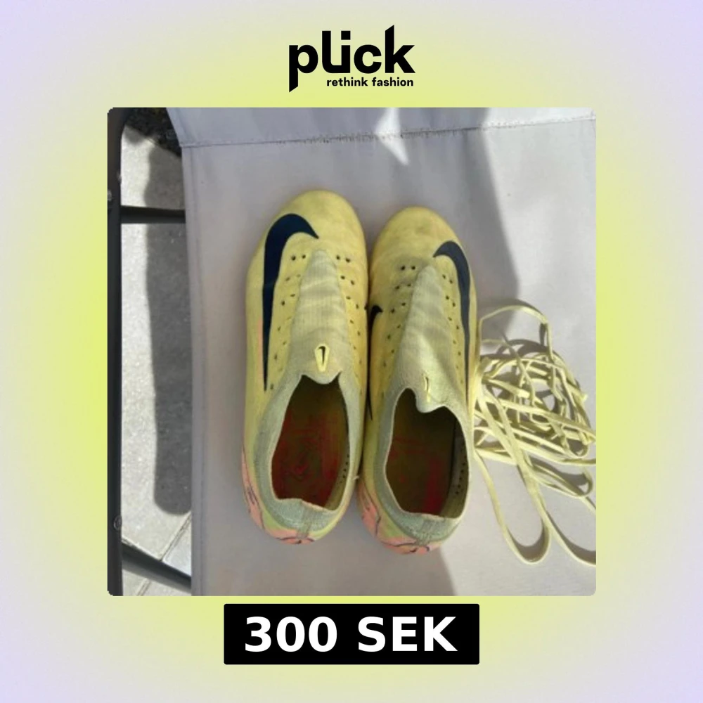 Säljer ett par gula Nike fotbollsskor med svart swoosh och orange detaljer. Skorna har en strömlinjeformad design, platt sula med dobbar och är tillverkade i syntetmaterial. Skosnören i matchande gul färg medföljer. Perfekta för dig som vill sticka ut på planen.