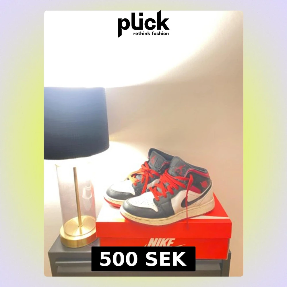Säljer ett par Nike Air Jordan 1 Mid sneakers i svart, vitt och rött med röda snören och klassisk Jordan-logga på plösen. Skorna har en rund tå, platt sula och är tillverkade i skinn och syntet. Perfekta för dig som vill ha en ikonisk och sportig look. Paketet tillhör till en Annan skor men de funkar om jag hitta paketet så sickar jag den