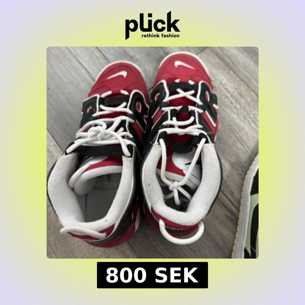 Säljer ett par Nike Air More Uptempo sneakers i rött med stora svarta AIR-bokstäver på sidorna. Skorna har vit sula, vita snören och detaljer i svart och vitt. Perfekta för dig som gillar en sportig och retro look. Pris går att diskutera