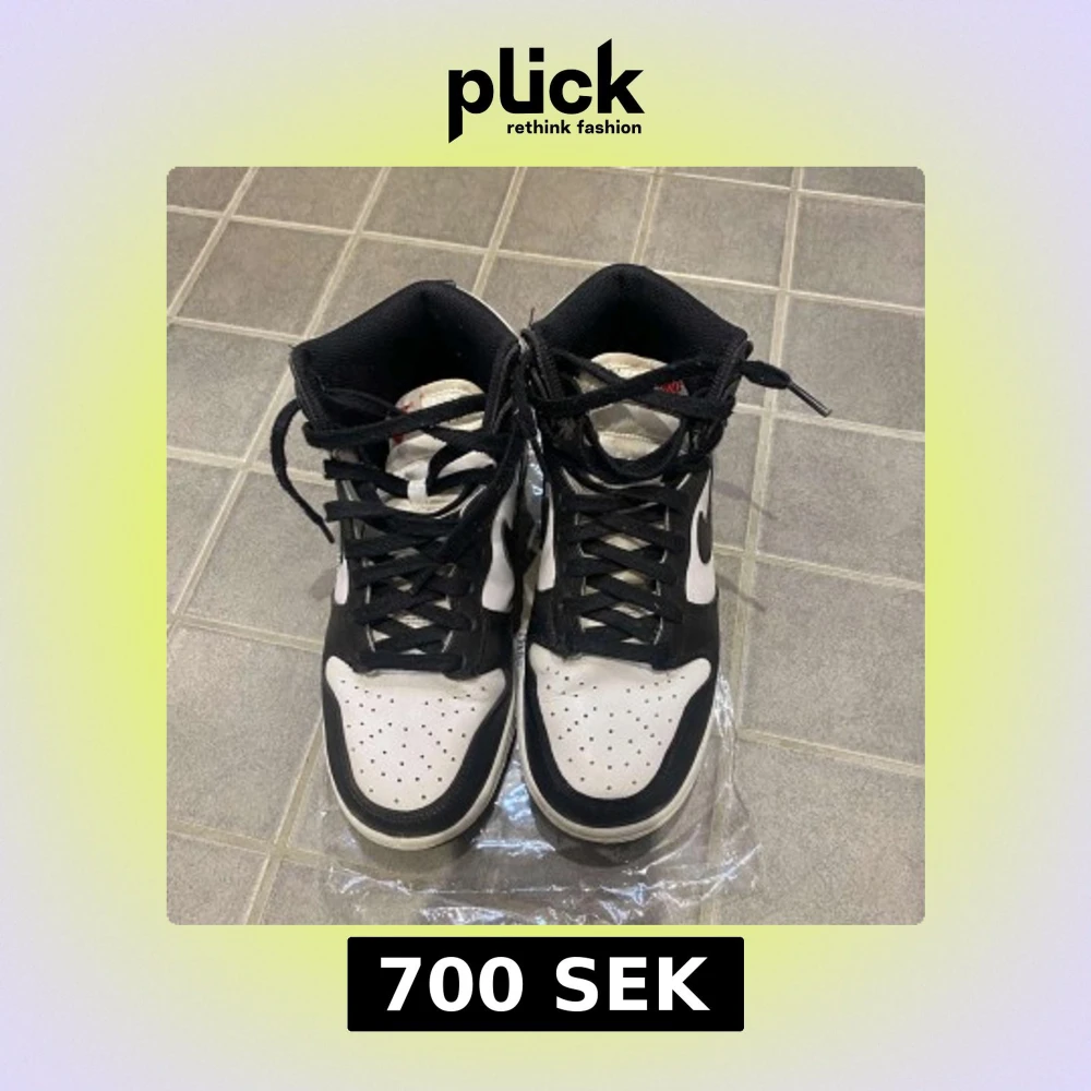 Säljer ett par Nike Dunk High sneakers i svart och vitt. Klassisk siluett med svart Swoosh, perforerad tå och snörning. Ovandel i skinn och textilfoder för skön passform. Perfekta för dig som gillar streetstyle och vill sticka ut med en ikonisk modell.
