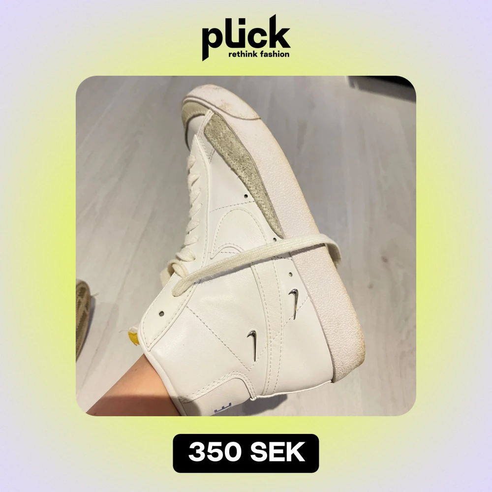 Säljer ett par vita Nike sneakers i skinn med snygg snörning och en högre modell. De har en stilren design med små silverdetaljer och en robust sula. Perfekta för både vardag och festliga tillfällen. Skorna är i mycket bra skick och redo för nya äventyr!