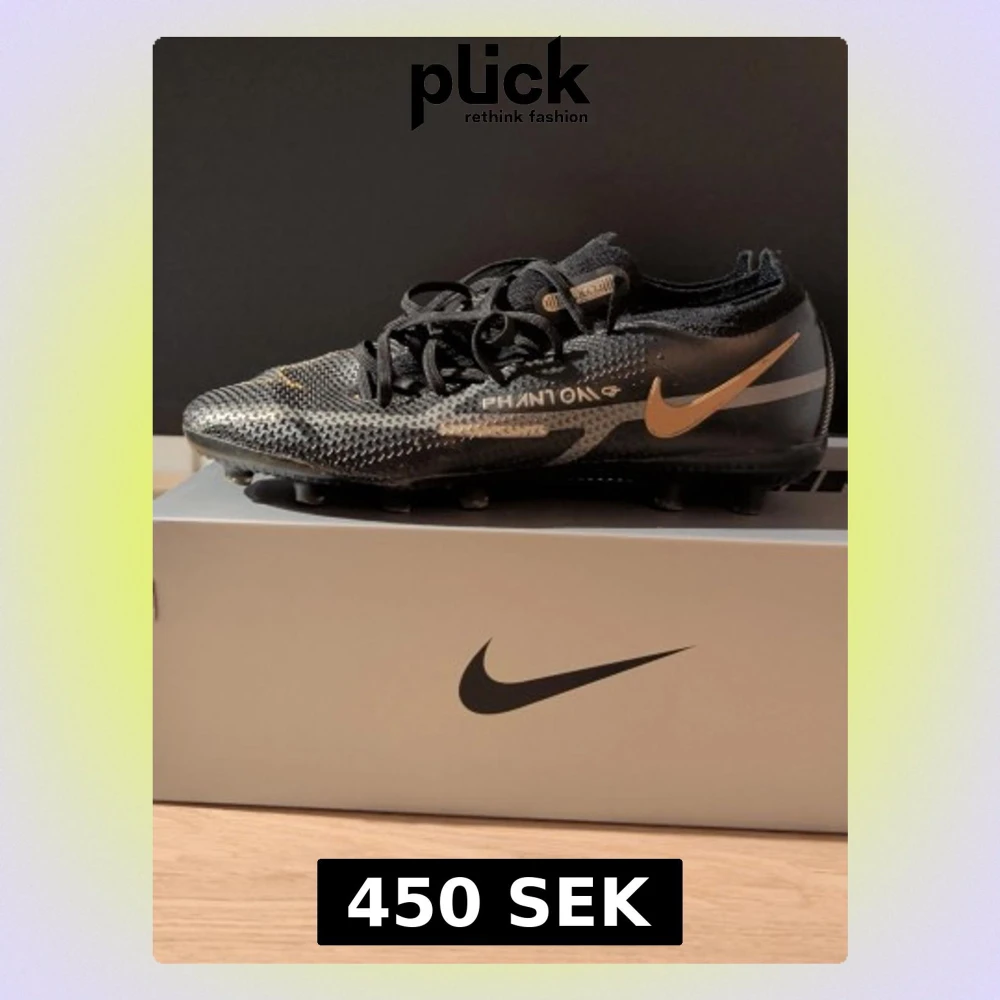 Säljer ett par Nike Phantom GT2 fotbollsskor i svart med guldiga detaljer och gråa inslag. Skorna har snörning, platt sula med dobbar och en stickad krage för extra komfort. Snyggt mönstrad ovandel i syntetmaterial och tydlig Nike-logga på sidan.