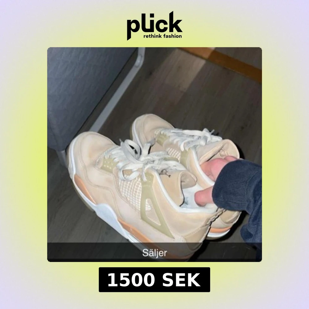 Säljer ett par snygga Nike Jordan 4 sneakers i beige och ljusa toner. Skorna har vita snören, mesh-detaljer på sidorna och en chunky vit sula med beige och orange inslag. Perfekta för dig som vill sticka ut med stilrena och trendiga sneakers.