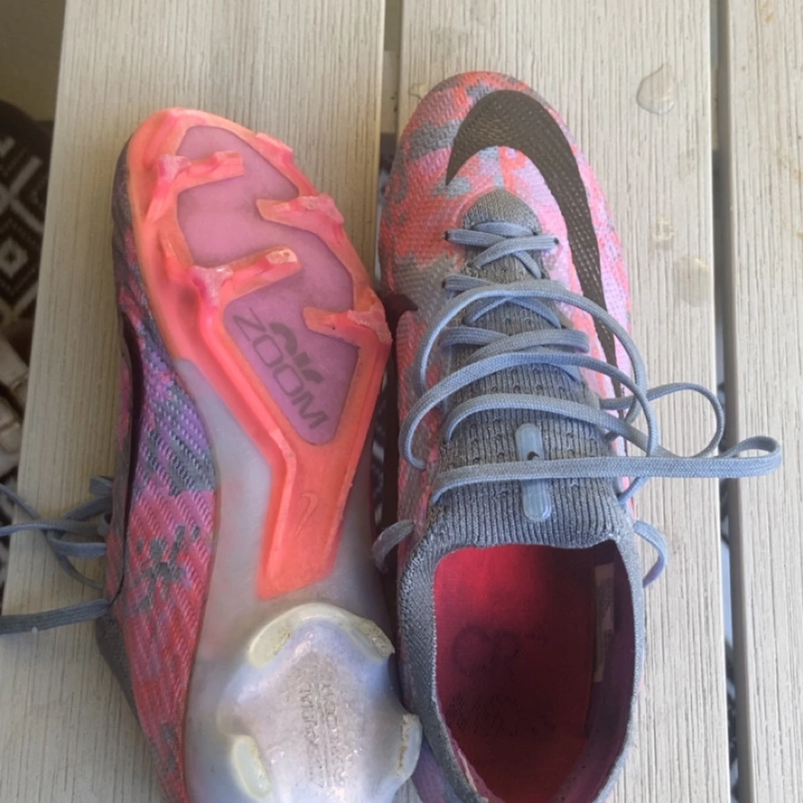 Säljer ett par Nike Mercurial Zoom fotbollsskor i grått och rosa med svarta detaljer. Skorna har stickad ovandel, snörning och en cool mönstrad design. Yttersulan är rosa med dobbar för bra grepp på planen. Perfekta för dig som vill sticka ut på matchen!