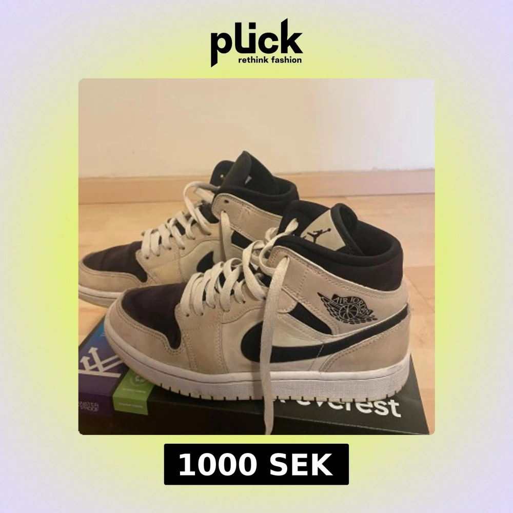 Snygga Nike Air Jordans i beige och svart med klassisk snörning och ikonisk Air Jordan-logga på sidan. Perfekta för en stilren look.