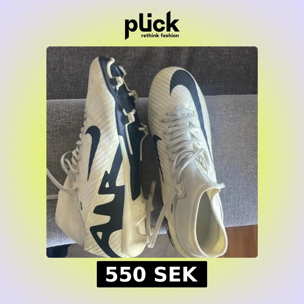 Snygga kräm vita fotbollsskor från Nike med svarta detaljer och snörning. Skorna har en modern design med dobbar för bra grepp på planen. Perfekta för fotbollsspelare som vill ha stil och funktion. Dom är endast använda 3 gånger för att det är fel storlek tyvärr så nästan helt nya.