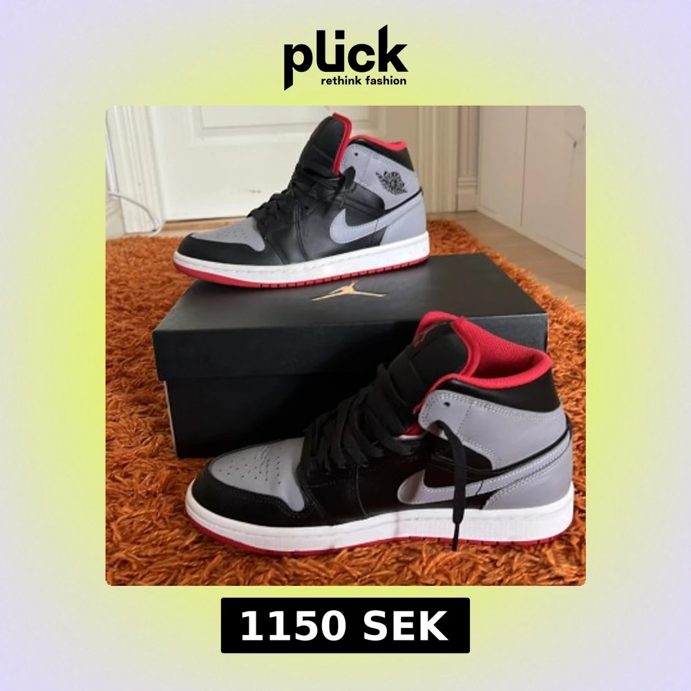 Nike Air Jordan 1 Mid i svart, cementgrå och röd. Knappast andvända i bra skick, storlek 40,5 låda med paketerings papperna ingår. Båda skorna är lite creasade på båda toeboxarna, inte mycket dock. Andvända ungefär 3 gånger, botten av skorna är inte jätte smutsiga, se på bilden. Hör av er om ni vill diskutera priset.