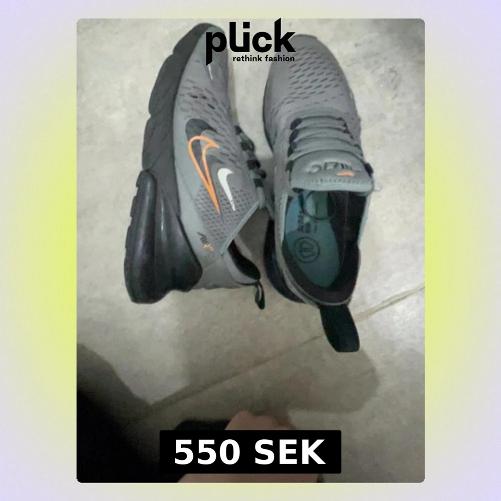 Säljer ett par grå Nike Air 270 sneakers med svart och orange detalj på sidan och logga på plösen. Skorna har snörning, ventilerande meshmaterial och en hög, svart sula med synlig Air-enhet. Perfekta för dig som gillar sportig och modern stil.