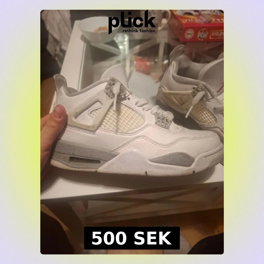 Säljer ett par Nike Air Jordan 4 White Cement sneakers i vitt skinn med grå och svarta detaljer. Klassisk meshpanel på sidorna, grå stänkmönstrad sula och ikonisk röd Jumpman-logga på plösen. Skorna har snörning och en chunky siluett som sticker ut.